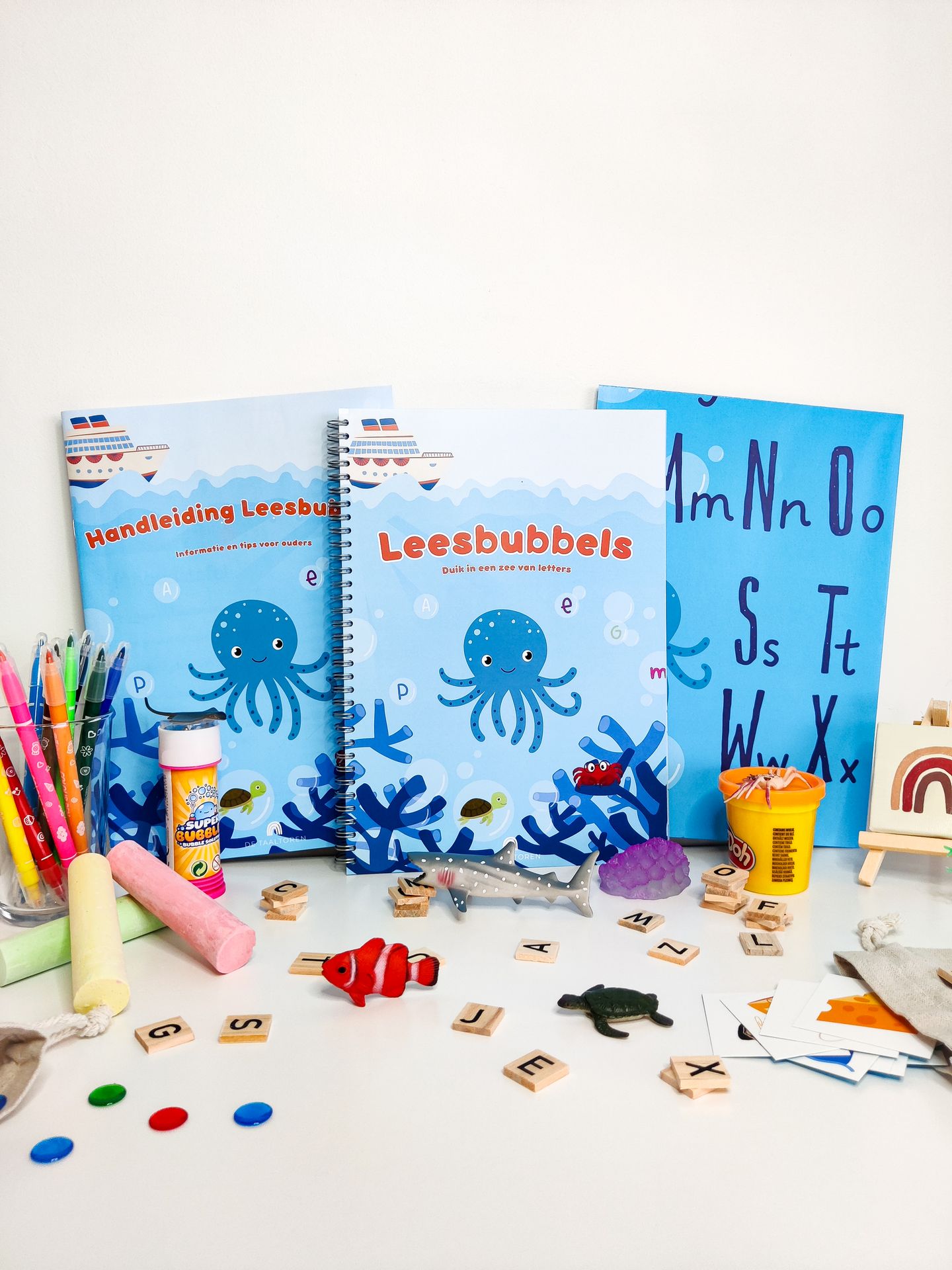 En exact dat is Leesbubbels: onze materiaalbox voor de voorbereidende leesvaardigheden! Samen met Ollie Octopus en zijn vriendjes leert jouw kleuter die vaardigheden op een speelse manier ontwikkelen. Het start heel eenvoudig, dus ook jouw jongste kleuter kan de eerste opdrachten al maken. Is het toch nog wat lastig? Geen probleem! Laat het dan gewoon even los en probeer later nog eens.
